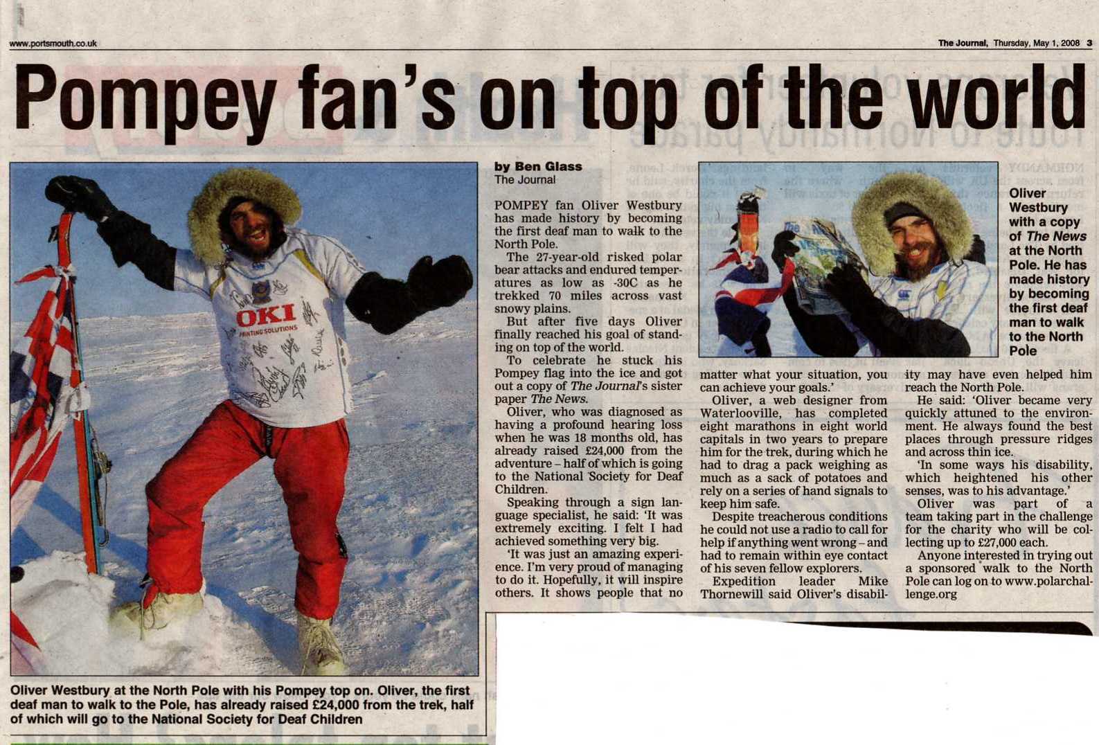 In April 2008, I Oliver Westbury became the first profoundly deaf person to reach the Geographic North Pole (90°N) on foot.